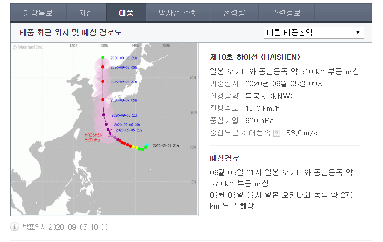 다들 코로나로 힘든 이때, 태풍이 많은 피해를 줄줄 알았는데 다행이 피해가는 모습니다. 이번 주말을 기점으로 태풍은 한동안 안올것 같은데 , 그래도 태풍 왼편이 동해쪽에 많은 영향을 줄것 같으니 해당지역에 계신 분들은 그래도 준비를 단단히 하시는 것이 좋아보입니다.