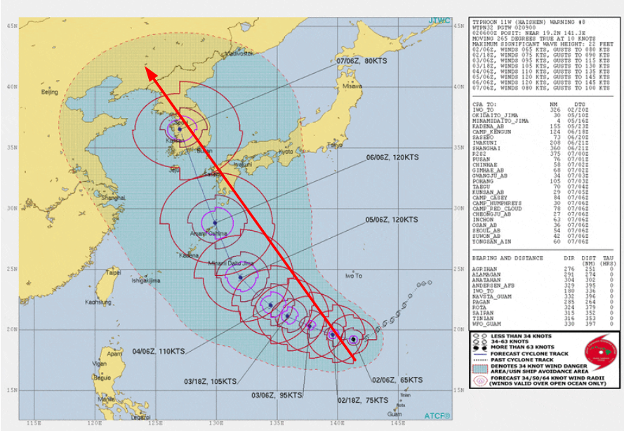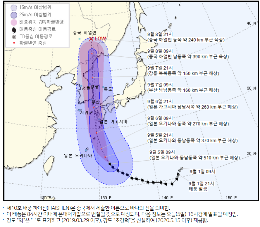 이전 예측 그림과는 꽤 차이가 있습니다. 다행이 한반도를 관통하지는 않고 , 동해상으로 올라가서 북한으로 바로 올라가는 그림으로 바뀌였습니다.