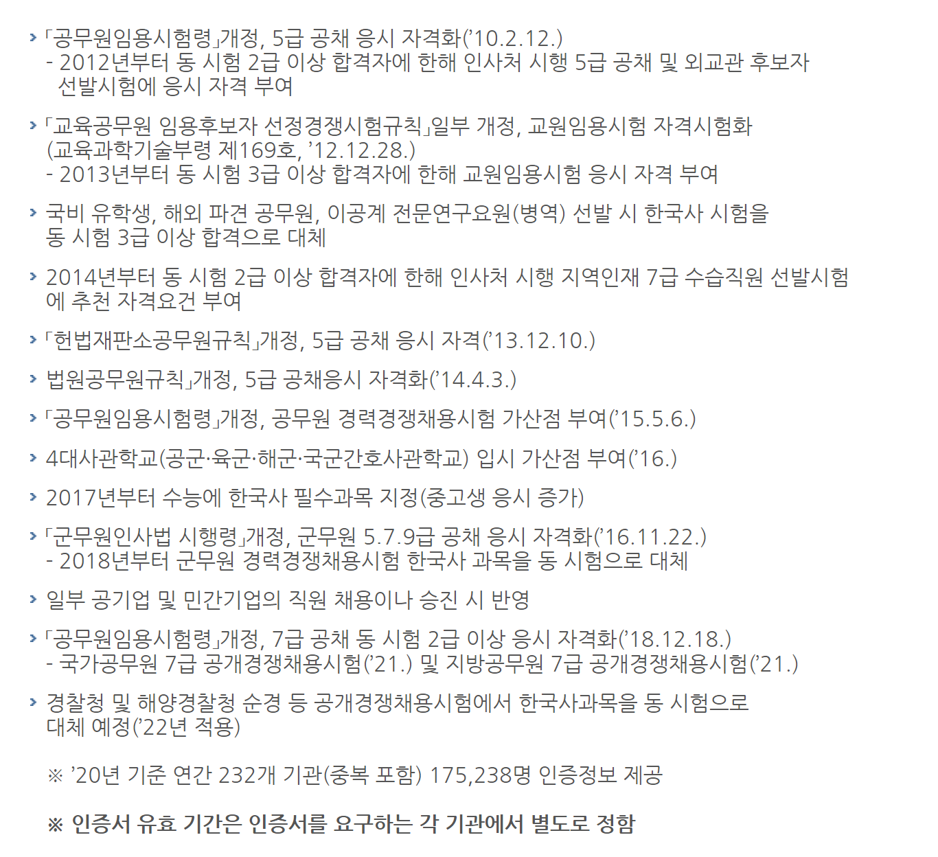 위와 같이 한국사능력시험에서 좋은 등급을 받게 되면, 공무원 채용시 많은 특전을 얻을 수가 있습니다. 만일 공무원을 준비중이신 분들은 위의 사항을 꼼꼼히 살펴 보기고 준비하시면 좋을 것 같습니다.