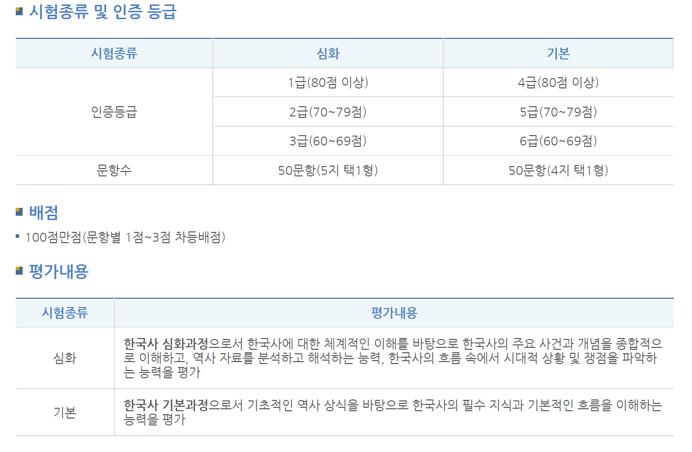 위와 같이 크게 심화와 기본으로 나누어지며, 모두 1급 부터 6급까지 이루어지며, 문항은 각각 50문항으로 이루어집니다.
