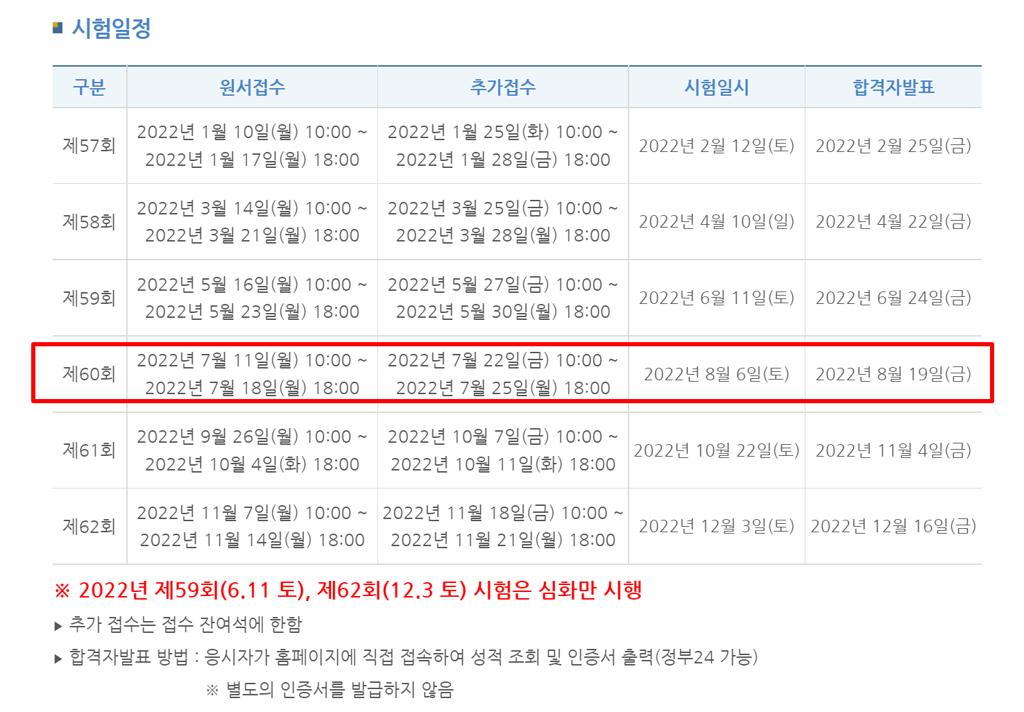 올해는 이렇게 6회 시험이 있으며, 이번은 60회차이며, 만일 부득히 하게 일정이 안되면 61회와 62회를 이용하시면 됩니다.