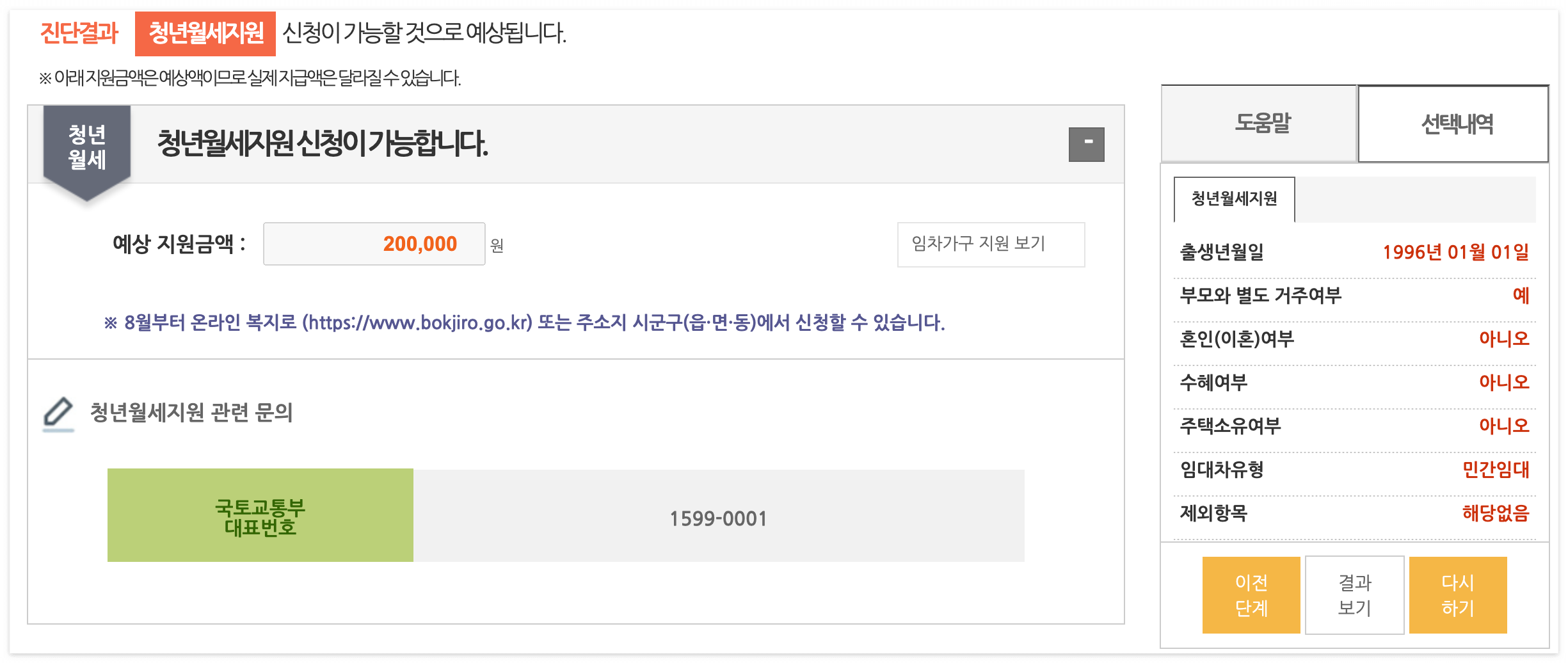 화면에 나오는 대로 현재 본인의 소득금액을 정상적으로 기입하면 진단결과가 나오는데 사실 그대로 기입하면 아래와 같이 자가진단결과가 나오니 바로 신청하시면 될것 같습니다. 위에서 말씀드렸다 시피 신청은 8월22일부터 가능합니다. 미리 진단만 해보시면 좋을것 같습니다.