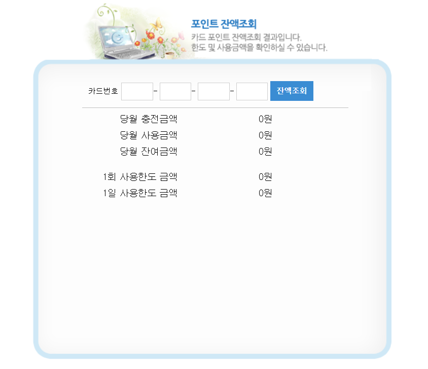 홈페이지에 접속을 하면 위와 같이 로그인창이 보입니다. 이때 카드번호를 입력하고 비밀번호는 회원명으로 입력하면 됩니다.