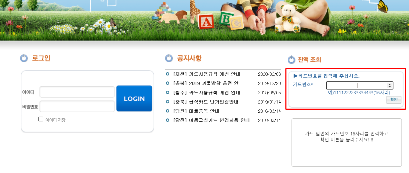 여기는 경남양산/충남공주/보령시/예산군/서천군/부여군/태안군의 아동급식카드만 조회가 가능하며 운영합니다.