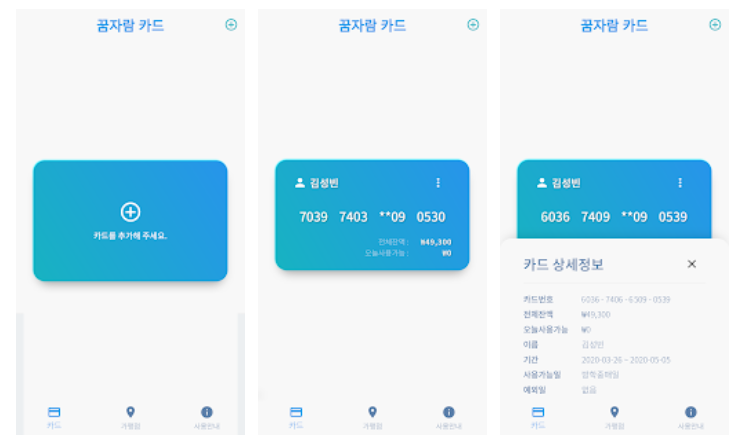 앱을 다운로드한 뒤에 카드를 추가해 두면 이후부터는 아주 간단하게 상세한 정보를 확인할 수가 있습니다. 또한 가맹점도 지도를 이용해서 보여주며, 구매제한 품목 등을 알려주기 때문에 자주 꿈자람카드를 이용하시는 분들은 앱을 받아서 잔액조회를 해보는 습관을 들이면 매번 카드번호 넣고 가맹점 찾고 이러한 번거로운 절차를 생략할 수 있어서 편리하게 이용이 가능합니다.
