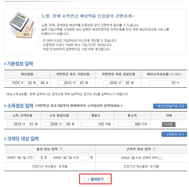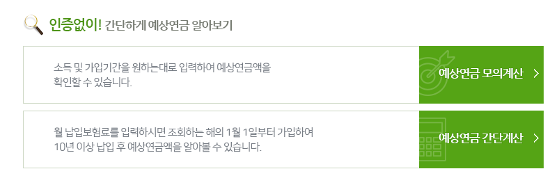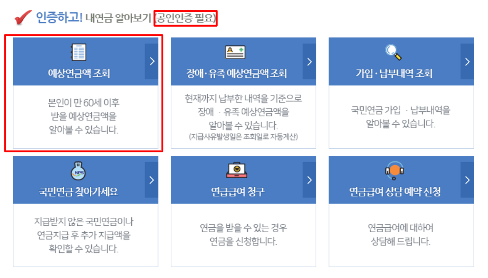 첫 번째 접속했을 때 화면에서 예상연금액 조회를 클릭합니다.