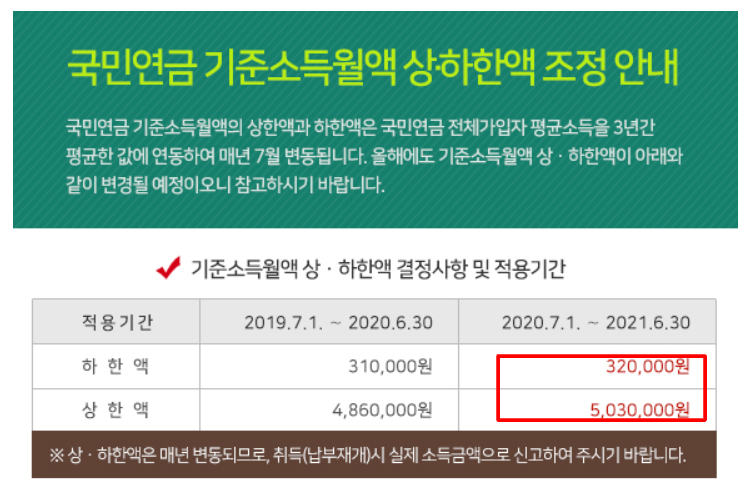 올해부턴 월 상한액이 위와 같이 하한액과 같이 변경이 되었습니다.