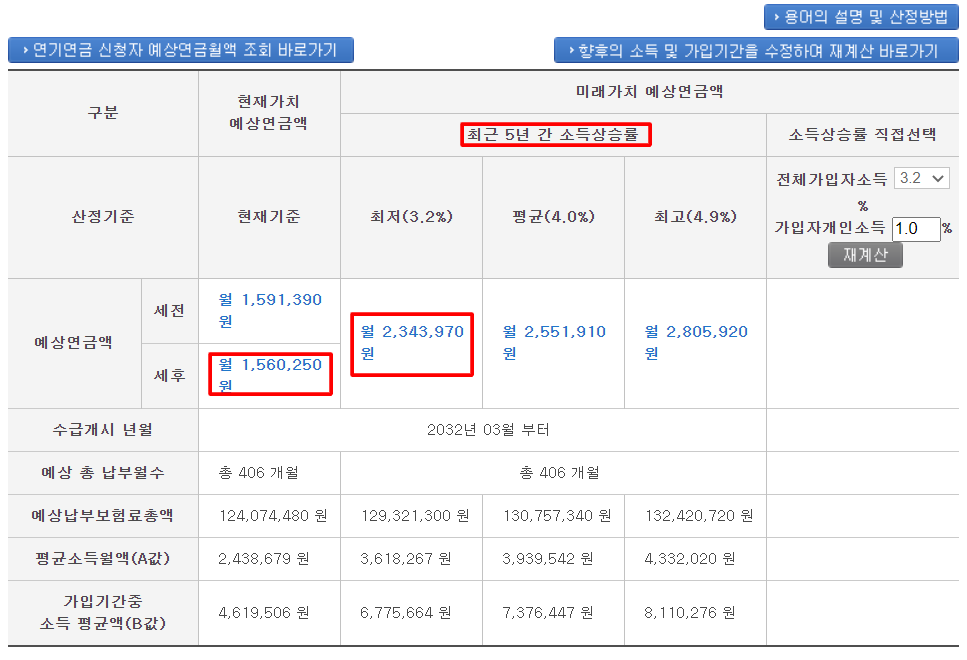 모의계산을 실제로 해보니 , 약 148만 원 정도를 받는 결과가 나왔습니다. 하지만, 이 결과는 순전히 모의 계산이며, 참고용으로만 사용이 가능하며 실제로 받는 연금 정보랑은 조금 차이가 있었습니다.