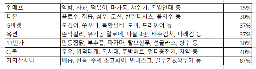 - 온라인 쇼핑몰(16개사) - 옥션, G마켓, 쿠팡, 11번 가등, '가치삽시다 플랫폼'