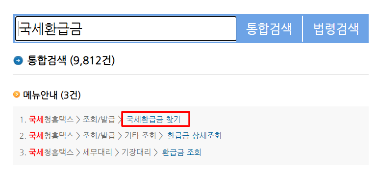 우선 홈택스 사이트에 접속하신 뒤에 검색을 누르시면 통합검색창이 나오는데 검색창에 "국세환급금" 이라고 타이핑을 하면 아래 메뉴가 안내가 됩니다.