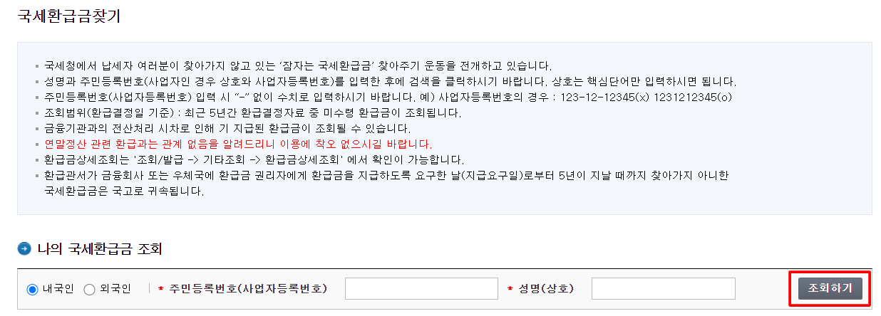 그럼 국세환급금 찾기 메뉴가 나오게 되며, 주민등록번호와 이름을 넣으신다음 조회하기를 누르면, 조회결과가 나오게 됩니다.
