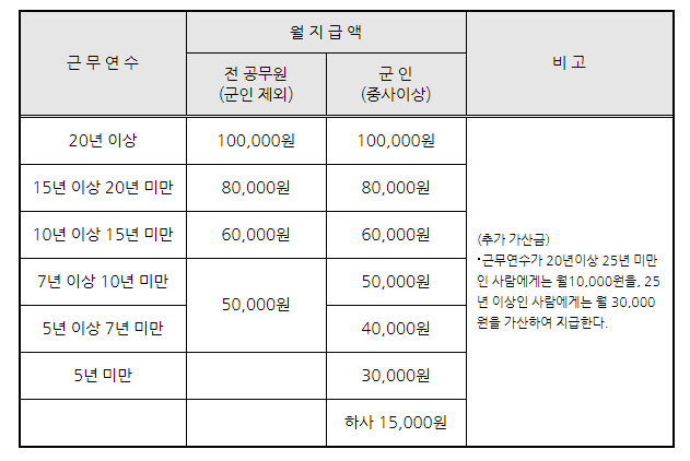이외에 정근수당은 추가로 가산금이 있습니다. 정근수당가산금도 근무연수기준이며, 5년에서 10년 미만은 5만원이 추가로 지급되며, 10년이상 ~ 15년 미만은 6만원, 15년이상 20년 미만은 8만원, 20년이상은 10만원이 지급됩니다. 공무원들은 참 수당이 많은 직업인거 같습니다. 하지만 군인의 경우에는 좀 다르게 적용됩니다. 아래의 표를 참고하시면 됩니다.