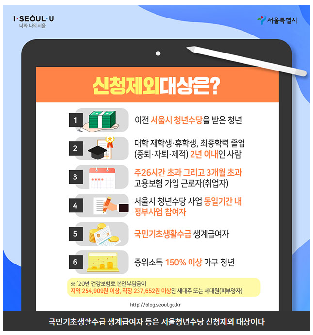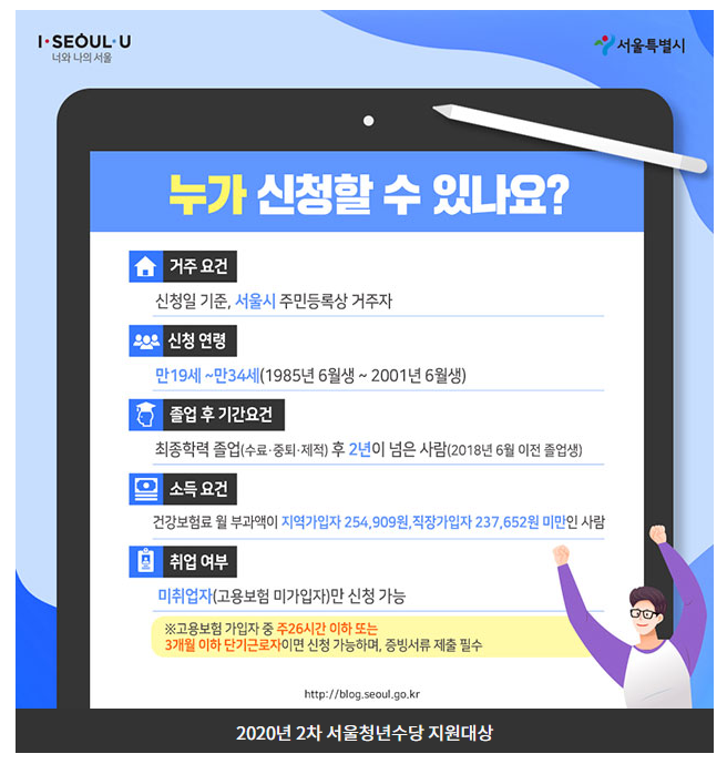 서울시에서 청년들에게 서울청년수당을 지급하는데 오는 6월30일부터 7월3일까지 2차 지원대상을 모집합니다. 서울시에 거주하고 졸업 후 2년이 지난 미취업청년이 대상인데 한달에 50만원씩 최대 6개월을 지급합니다. 그럼 , 서울청년수당 신청방법과 조건 및 지원대상에 대해서 자세히 알아보도록 하겠습니다. 총정리를 했으니 쭉 훌터 보시면 서울청년수당신청에 많은 도움이 될것 같습니다. 그리고 상반기에도 신청자 모집시에 2만6천명가량 모였기 때문에 좀더 자세히 알아보시는 것이 좋을 것 같네요.