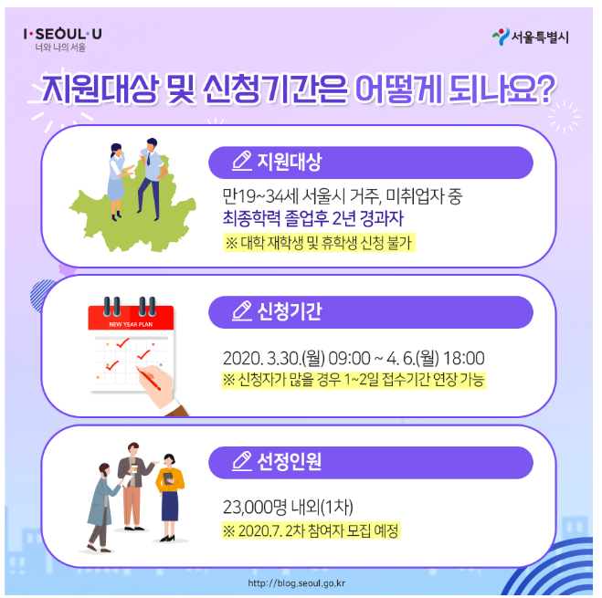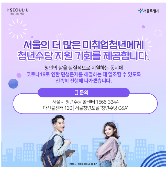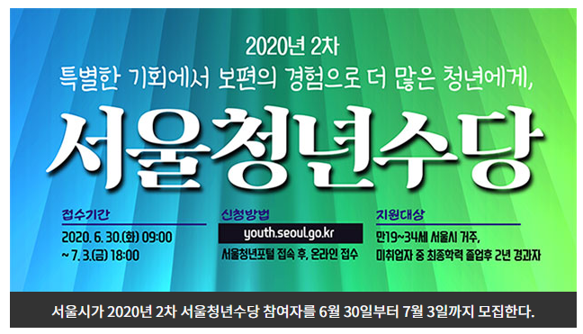 서울시에서 청년들에게 서울청년수당을 지급하는데 오는 6월30일부터 7월3일까지 2차 지원대상을 모집합니다. 서울시에 거주하고 졸업 후 2년이 지난 미취업청년이 대상인데 한달에 50만원씩 최대 6개월을 지급합니다. 그럼 , 서울청년수당 신청방법과 조건 및 지원대상에 대해서 자세히 알아보도록 하겠습니다. 총정리를 했으니 쭉 훌터 보시면 서울청년수당신청에 많은 도움이 될것 같습니다. 그리고 상반기에도 신청자 모집시에 2만6천명가량 모였기 때문에 좀더 자세히 알아보시는 것이 좋을 것 같네요.