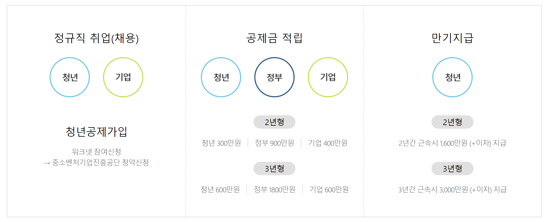 청년들고 기업/정부가 공동으로 공제금을 적립 후 2년 또는 3년간 근속했을 때 , 청년들이게 성과보상금 형태로 만기공제금을 지급해 주는 제도입니다.