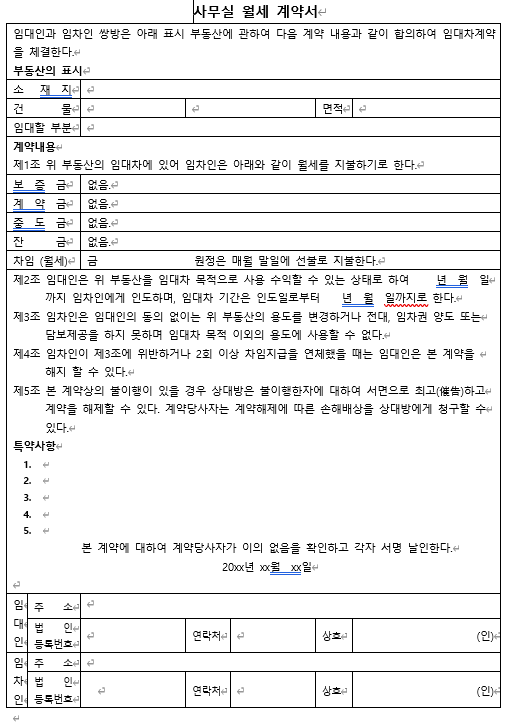 사무실 월세 계약서 양식 무료 다운로드