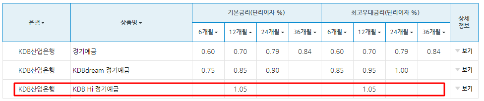 크게 세가지 상품이 있는데, 정기예금, KDBdream 정기예금과 KDB Hi정기예금이 있는데 그중에서 제일 이율이 좋은 상품은 KDB Hi 정기예금이며, 기본금리 및 최고우대금리가 1.05%입니다. 단 KDB Hi정기예금은 아쉽게도 12개월만 가능합니다.