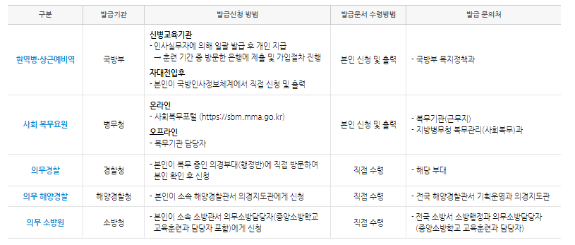 현역병, 상근예비역, 의무경찰, 해양의무경찰, 의무소방원, 사회복무요원