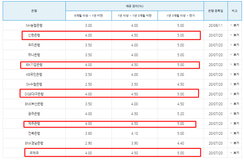 근데 잘 살펴보시면, 은행별로 금리가 조금 다름닙니다. 만기를 기준으로 보면 최초 4.4% 에서 최대 5%까지고, 1년이상 3개월미만일 경우에도 꽤 차이가 나는 것을 확인하실수 있습니다.