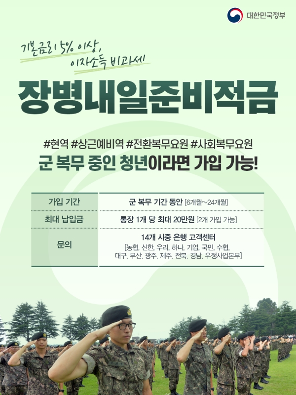 안녕하세요. 오늘은 군인들에게 특화되어 있는 장병들의 이용할 수 있는 장병내일준비적금 금리에 대해서 알아보고 은행별로 금리가 얼마나 틀린지 알아보도록 하겠습니다. 장병내일준비 적금은 병역의무수행자들의 전역 후 목돈 마련을 위한 고금리 자유적립식 정기적금 상품으로 2018년에 출시 되었습니다. 요즘은 군인월급도 상당히 올랐기 때문에 군인들은 반드시 들어두는 것이 좋습니다. 아주 높은 이율이 장점이기 때문에 군인들은 필수적으로 들어두는 것이 좋습니다.