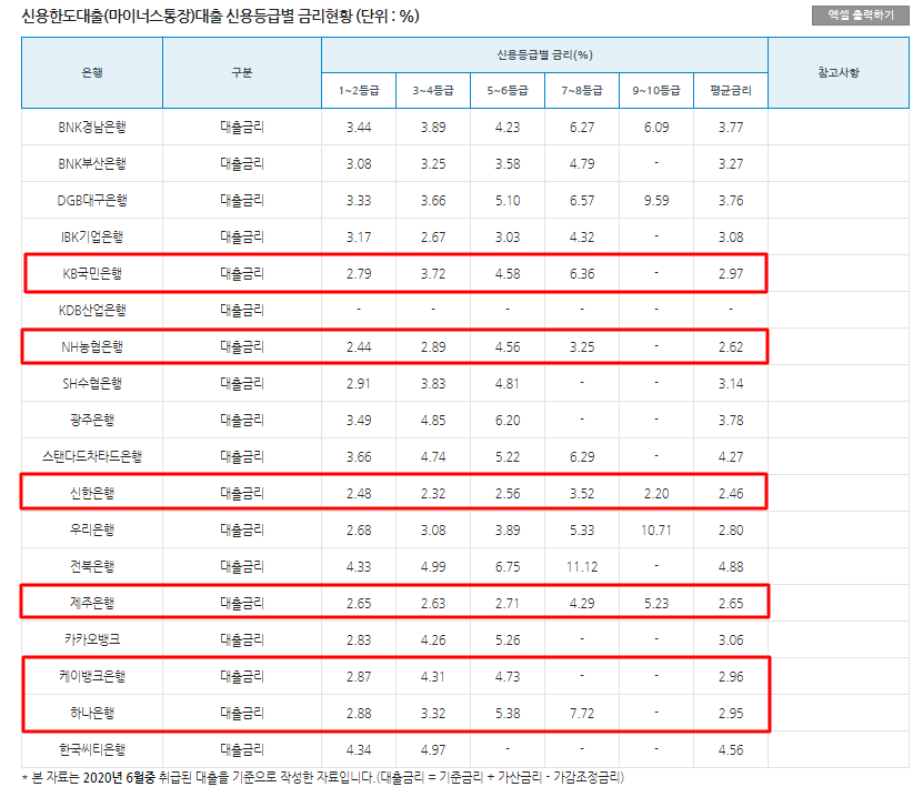 위의 표를 한번 보시면, 은행별로 금리가 다 틀립니다. 평균금리가 가장 낮은 곳은 신한은행입니다. 심지어 신용등급이 9 ~10읃급인경우에도 2.2%대를 유지하는데 , 아무리봐도 담당자가 금리를 잘못 기재 한것 같습니다. 1~2등의 2.48%보다 더 낮은 금리를 제공한다는 것이 좀 이상합니다. 위의 표에서 신한은행의 경우에는 9~10등급은 제외하는 것이 맞을 것 같습니다.