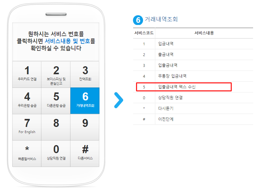 1588-5000 --> 6 (거래내역조회) --> 5 ( 입출금내역팩스수신 ) --> 3 ( 1 은 입금내역, 2는 출금내역, 3번 입출금내역 )