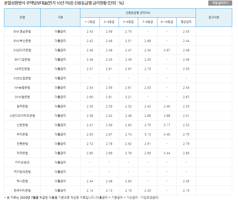 오늘은 분할상환방식의 주택담보대출의 경우 신용등급별로 은행별로 금리가 다른 데 1금융권위주로 금리가 어떻게 되는지 확인해 보도록 하겠습니다.