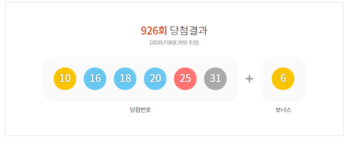 어김없이 926회 동행복권 추첨이 어제 있었습니다. 코로나19 로 인해 다들 힘든시기를 겪고 있는 시점에 혹시라도 1등에 당첨되신 분들은 정말 너무 너무 축하드립니다.